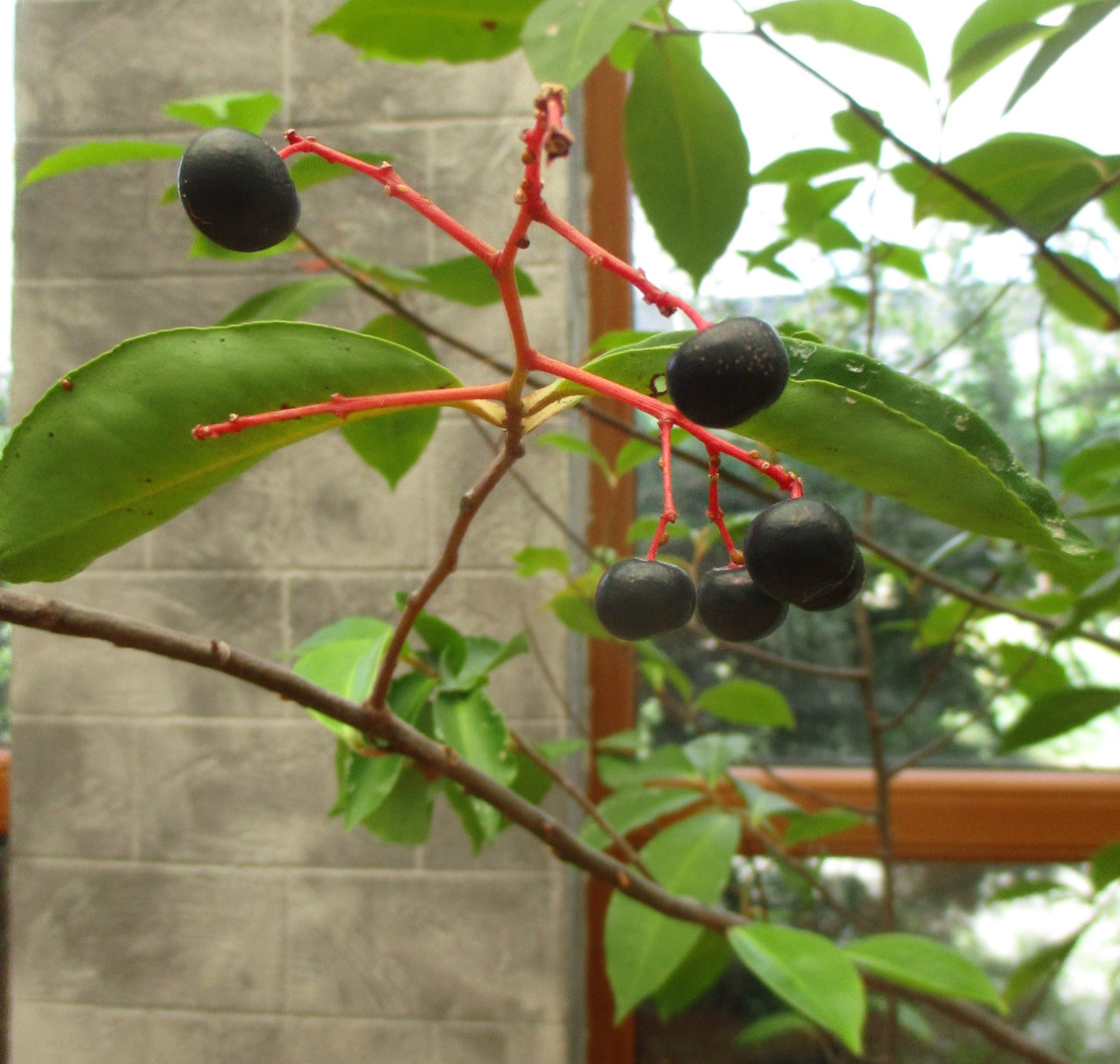 10.6.2023 - první úroda je tady. Plody jsou v plné zralosti černé, menší bobule, které rostou na střapcích. Chuť je velmi dobrá, nejprve lehce kyselá, osvěžující, poté se mění v příjemně nahořklou. Plod obsahuje jedno menší semínko, rostlina je samosprašná.
